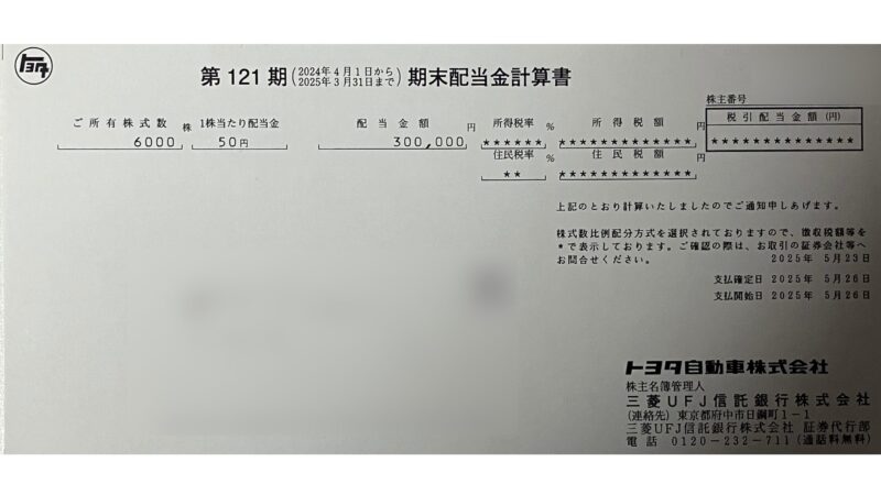 第121期、トヨタ自動車株の配当金(2024年 期末配当金)は、300,000円でした。(1株当たり配当金は50円)※株式分割前に換算すると250円